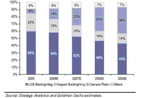 可拍照手機(jī)有取代傳統(tǒng)中低端數(shù)碼相機(jī)的趨勢(shì),并且消費(fèi)者期望能夠在低光照亮度的條件下拍攝高質(zhì)量的照片,因而采用Flash LED作為閃光燈是提高數(shù)碼相機(jī)性能的重要措施。Flash LED的光學(xué)特性決定它既可以作為拍照的閃光應(yīng)用,也可以用于視頻拍攝時(shí)補(bǔ)光,甚至是用于照明的電筒應(yīng)用。因此Flash LED在手機(jī)中的應(yīng)用將會(huì)越來越普遍,表1為Flash LED作為閃光燈在手機(jī)LED應(yīng)用中的比例走勢(shì)。