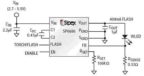 3)SP6686、SP6685和SP7685系列產(chǎn)品可提供300mA至1.2A閃光電流,適用于200萬(wàn)像素及以上相機(jī)應(yīng)用,圖3為該系列產(chǎn)品的典型應(yīng)用電路: