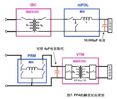 FPA的瞬變反應(yīng)較IBA理想。如前述,IBA把電感器放在中轉(zhuǎn)母線與負(fù)載之間,產(chǎn)生電流慣性。在FPA分比母線與負(fù)載之間沒有電感器(圖6),由于VTM不受電感慣性左右,可快速的反應(yīng)負(fù)載變化。在分比母線的電容由于沒有電感的阻隔,可對負(fù)載有效旁路,該電容相等于在負(fù)載加上1/K2倍電容值,這便無須在負(fù)載點加上大電容。圖7清楚表示在FPA只需用上4uF的電容便可以取代IBA中的10000uF電容。