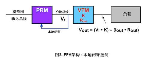本地閉環(huán)(圖8)是最簡單的方法。PRM感應(yīng)它自己的輸出電壓,再調(diào)整及維持分比母線電壓在一個常數(shù)。負(fù)載電壓按VTM的輸出阻抗的比例升降(VfK-IoutRout)。一個PRM可同時連接多個VTM。
