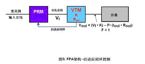 自適應(yīng)閉環(huán)(圖9)。由VTM把訊號傳送給PRM,讓PRM調(diào)整分比母線。以補(bǔ)償VTM的輸出阻抗。自適應(yīng)閉環(huán)只需要在VTM與PRM之間接上簡單、非隔離的反饋電路,它的穩(wěn)壓精度便可達(dá)+/-1%。