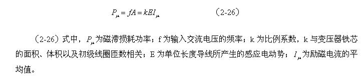 (2-25)式中,A為一個(gè)周期內(nèi)變壓器鐵芯的磁滯損耗,單位是焦耳;E為單位長度導(dǎo)線所產(chǎn)生的感應(yīng)電動(dòng)勢(shì),單位為伏; 為勵(lì)磁電流的平均值,單位為安培;T為輸入交流電壓的周期,單位為秒,f為脈沖頻率,或開關(guān)電源的工作頻率,單位為赫芝;k為比例系數(shù),它是一個(gè)與選用單位制和變壓器鐵芯面積、體積以及初級(jí)線圈匝數(shù)等參數(shù)相關(guān)的常量。在(2-21)、(2-22)、(2-23)、(2-24)式中,沒有比例系數(shù)k,是為了使問題簡單,便于分析。