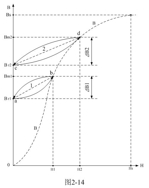 在圖2-14中,虛線B或0-B-B為變壓器鐵芯的初始磁化曲線;當(dāng)輸入直流脈沖的幅度比較低,或脈沖寬度比較窄時(shí),磁通密度由Br1沿著磁化曲線a-b上升,到達(dá)Bm1后脈沖結(jié)束,然后磁通密度由Bm1沿著磁化曲線b-a下降回到Br1,虛線1是其等效磁化曲線。