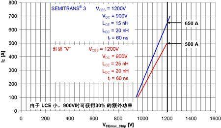當(dāng)使用低電感模塊時,可以實現(xiàn)高可靠性和最高效率。圖3顯示SEMITRANS®3和與其作對比的不同形狀封裝“C”之間的差異。由于模塊的電感小,SEMITRANS®3在芯片的最大反向電壓達(dá)到之前可切換的電流值要高30%。受益于主端子加上用于DCB的對稱并聯(lián)設(shè)計,SEMITRANS®模塊可實現(xiàn)低電感(請注意,依托模塊電感,半導(dǎo)體芯片上實際產(chǎn)生的電壓永遠(yuǎn)高于端子上產(chǎn)生電壓)。