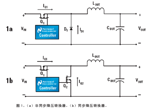 圖1是非同步和同步降壓轉換器的原理圖。非同步降壓轉換器使用FET和肖特基二極管作為開關器件(圖1a),當FET打開時,能量傳遞到輸出電感和負載。當FET關斷,電感中的電流流過肖特基二極管。如果負載電流高于輸出電感的紋波電流的一半,則轉換器工作在連續(xù)導通模式。