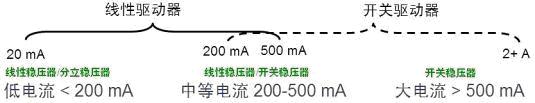 市場(chǎng)上典型的LED驅(qū)動(dòng)器包括兩類,即線性驅(qū)動(dòng)器和開(kāi)關(guān)驅(qū)動(dòng)器;大概的適用范圍見(jiàn)圖1。如電流大于500mA的大電流應(yīng)用采用開(kāi)關(guān)穩(wěn)壓器,因?yàn)榫€性驅(qū)動(dòng)器限于自身結(jié)構(gòu)原因,無(wú)法提供這樣大的電流;而在電流低于200mA的低電流應(yīng)用中,通常采用線性穩(wěn)壓器或分離穩(wěn)壓器;而在200至500mA的中等電流應(yīng)用中,既可以采用線性穩(wěn)壓器,也可以采用開(kāi)關(guān)穩(wěn)壓器。