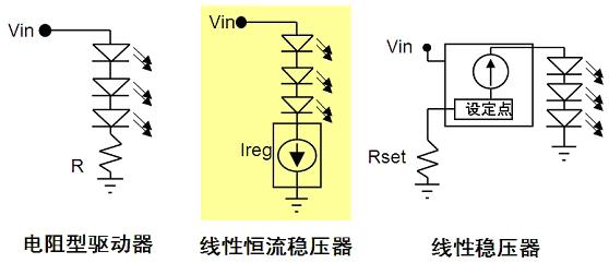 開(kāi)關(guān)穩(wěn)壓器的能效高,且提供極佳的亮度控制。線性穩(wěn)壓器結(jié)構(gòu)比較簡(jiǎn)單,易于設(shè)計(jì),提供穩(wěn)流及過(guò)流保護(hù),且沒(méi)有電磁兼容性(EMC)問(wèn)題。