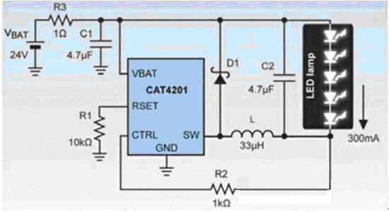 智能樓宇中的備用電源一般為直流24V,市電斷電之后仍需要備用照明長(zhǎng)時(shí)間的工作,省電是備用照明的重點(diǎn),此時(shí)正是電感型轉(zhuǎn)換器LED驅(qū)動(dòng)器的用武之地。圖3說(shuō)明了如何利用CAT4201從一個(gè)24V電源來(lái)驅(qū)動(dòng)5只1W的LED。