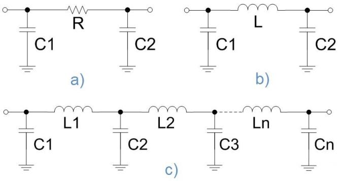圖1:常見(jiàn)EMI/RFI濾波器類型的結(jié)構(gòu)示意圖:a)π型RC;b)π型LC;c)LC梯形。