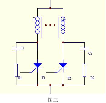 通常采取的辦法是:1)采用共軛電感,以保證動態(tài)均流;2)并聯(lián)RC電路以吸收浪涌電壓;3)盡量選用通態(tài)壓降一致的晶閘管并聯(lián)工作;4)嚴(yán)格安裝工藝,保證各支路分布電感盡量一致,如圖三所示