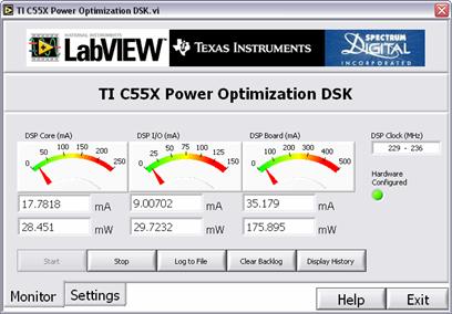 采用LabView和C55電源優(yōu)化DSK(C55PowerOptimizationDSPStarterKit),設(shè)計(jì)小組能嘗試采用不同的實(shí)施方案,并用類似于圖3所示的GUI工具對(duì)功耗加以調(diào)節(jié)。