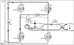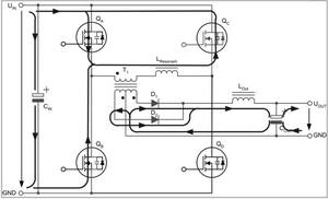 兩個(gè)互為對(duì)角的全橋開關(guān)不是同時(shí)驅(qū)動(dòng),而是通過相移的方法在啟動(dòng)命令之間引入預(yù)定義的短期延遲。這種延遲由控制電路的電壓回路進(jìn)行調(diào)節(jié),從而在兩個(gè)驅(qū)動(dòng)信號(hào)之間產(chǎn)生相移。這種相移技術(shù)的特殊之處在于,它可啟動(dòng)兩個(gè)與變壓器串聯(lián)的開關(guān),而變壓器的電壓卻為零。