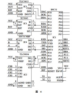 TLC0834是4路8位A/D轉(zhuǎn)換器,采集1路電壓和3路電流信號;TLC5615是10位串行D/A,將控制量變?yōu)槟M電壓信號,去控制可控硅交流調(diào)壓;X25045是含WDT和EEPROM的多功能電路,負責單片機系統(tǒng)的安全監(jiān)視和重要參數(shù)的保護;SN75176是RS485接口,實現(xiàn)連網(wǎng)監(jiān)控。