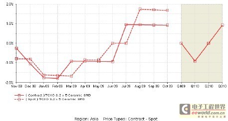 10月份振蕩器的平均現(xiàn)貨市場價(jià)格是1.42美元,合同價(jià)格是1.17美元。有一些跡象表明2010年第一季度需求將放緩,而供應(yīng)將會改善。這種趨勢可能使該市場恢復(fù)供需平衡。第四季度振蕩器的合同價(jià)格預(yù)計(jì)將持穩(wěn),2010年第一季度下降0.2%。