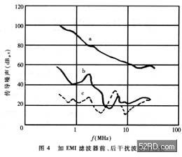 EMI濾波器能有效抑制單片開關(guān)電源的電磁干擾。圖4中曲線a為不加EMI濾波器時(shí)開關(guān)電源上0.15MHz~30MHz傳導(dǎo)噪聲的波形(即電磁干擾峰值包絡(luò)線)。曲線b是插入如圖3(d)所示EMI濾波器后的波形,能將電磁干擾衰減50dBμV~70dBμV。顯然,這種EMI濾波器的效果更佳。[page]
