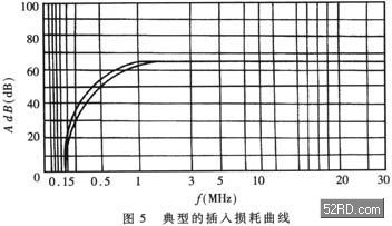 插入損耗用分貝(dB)表示,分貝值愈大,說明抑制噪聲干擾的能力愈強(qiáng)。鑒于理論計(jì)算比較煩瑣且誤差較大,通常是由生產(chǎn)廠家進(jìn)行實(shí)際測量,根據(jù)噪聲頻譜逐點(diǎn)測出所對應(yīng)的插入損耗,然后繪出典型的插入損耗曲線,提供給用戶。