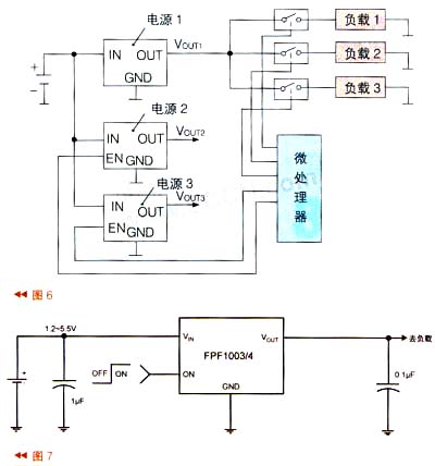 在實際應(yīng)用中,往往由于電路復(fù)雜而采用電源管理IC及多個負(fù)載開關(guān)組成的負(fù)載管理系統(tǒng),如圖6所示。圖6中有3個電源,輸出不同的電壓。電源1給負(fù)載1~3供電。為了控制負(fù)載1~3的通電或失電,在電源與負(fù)載之間設(shè)了3個負(fù)載開關(guān)。電源2、電源3則由電源管理IC來控制其負(fù)載的通電或失電。
