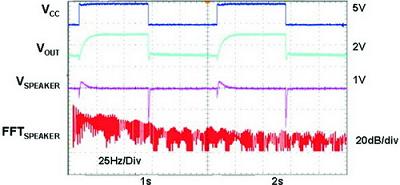 圖2耳機驅(qū)動器上電和斷電時耳機上測到的電壓波形和頻譜