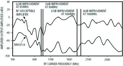 圖6Maxim公司的耳機驅(qū)動器MAX9724極大提升了抗射頻解調(diào)能力