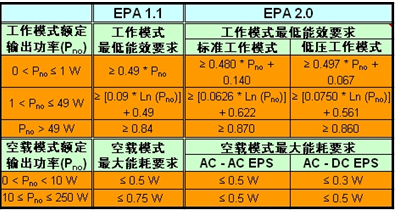 表1:美國環(huán)保署“能源之星”外部電源的1.1及2.0版規(guī)范。