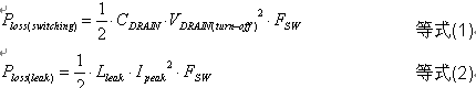要滿足上述規(guī)范對外部電源工作能效及待機能耗的要求,我們首先需要分析清楚損耗的來源。事實上,就工作時的損耗來說,主要包括兩個方面,分別是開關損耗和由泄漏電感導致的損耗,這兩類損耗分別可以用等式(1)和等式(2)來量化: