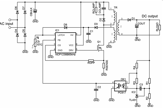 這系列控制器還采用輕載時頻率反走技術和跳周期模式,降低輕載時的開關頻率,從而提升能效;同時,開關頻率在25 kHz時鉗位,從而消除可聽噪聲。此外,這系列器件提供多種保護特性,如雙啟動電流電平、輸入欠壓及主電源過壓保護、過載保護、雙過渡保護閾值、軟啟動和閂鎖保護等。這系列器件還提供可選的動態(tài)自供電(DSS)功能,從而無需輔助繞組; 并內置斜坡補償,不需要外部設定。以NCP1238為例,這器件的典型應用電路圖如圖2所示。