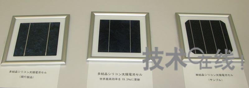 左起依次為現(xiàn)有的多晶Si電池單元、單元轉(zhuǎn)換效率為19.3%的多晶Si電池單元,以及此次宣布涉足市場的單結(jié)晶Si電池單元(樣品)。