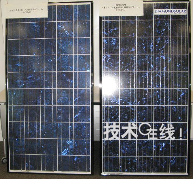 現(xiàn)有的輸出功率185W多晶Si型面板(左)和將于2010年6月投放日本市場的190W多結(jié)晶Si型面板。通過將各單元上作為電極的總線布線從2根增至4根,提高了輸出功率。