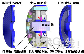 為了有效協(xié)調(diào)兩種磁鐵,名古屋工業(yè)大學(xué)采用了SMC(Soft Magnetic Composites=軟磁性復(fù)合材料)鐵心。SMC鐵心是對鐵粉等帶有磁性的粒子表面被覆絕緣層,并壓縮成形和經(jīng)熱處理而制成。能夠以低成本量產(chǎn)和成形具有復(fù)雜三維構(gòu)造的磁性部件。