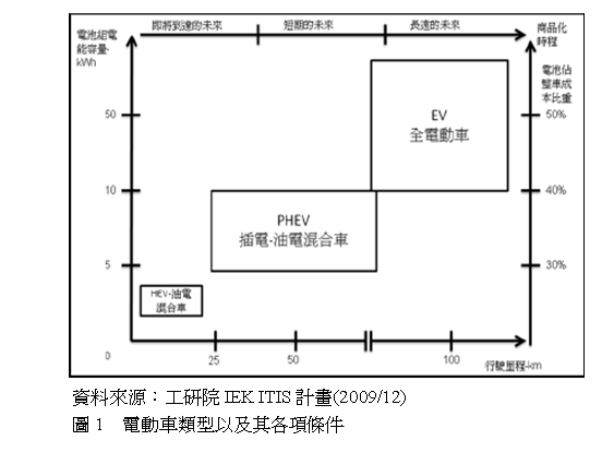 2009年車用鋰電池目前佔(zhàn)整體鋰電池應(yīng)用約1%市場比重很小,使用到電池做為電力系統(tǒng)的電動車型態(tài)包括HEV、PHEV、EV,這三種車輛可行駛的里程以及對於電池容量的要求如圖1。對於電池能量的需求、一次充電後可行駛的里程以及電池組佔(zhàn)整車成本的比重都是EV>PHEV>HEV,當(dāng)然EV是最理想的電動車型態(tài),但是以目前的電池材料技術(shù)尚難以達(dá)到,所以電動車的發(fā)展也仍然必需循序漸進(jìn)的進(jìn)行。由使用電池?cái)?shù)量較少的HEV先用,再逐步擴(kuò)展到EV市場。