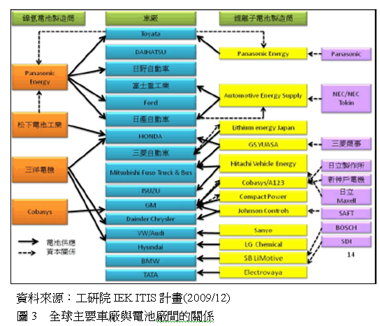 全球車用電池廠商以Sanyo、Cobasys、Panasonic為首,而隨著HEV、PHEV、EV..等話題不斷的吵熱,也吸引越來越多廠商投入市場。當(dāng)前電池芯廠商的家數(shù)相較於全球車廠的家數(shù)少,所以車廠與電池芯廠間如何取得合作關(guān)係以確保電池芯的來源就相當(dāng)重要。當(dāng)前各家車廠與電池芯廠的合作關(guān)係如圖3,當(dāng)前重點(diǎn)的歐美、日系以及韓系的車廠都己有確切的合作結(jié)盟廠商。