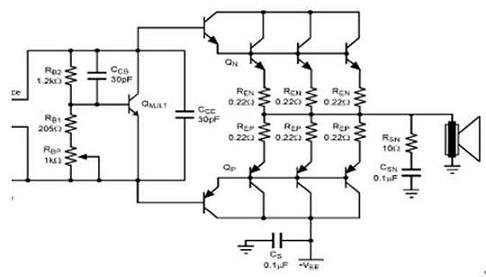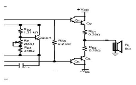 改善交越失真的最有效方法便是減少RE的電阻。對于相同數(shù)值的RE,一個平行形式的輸出可降低用來改善線性度的整體RE電阻值。同時,假如每一個級的RE都較大,那便可為輸出晶體管帶來更佳的匹配性和電流平衡。此外,RE也關(guān)系到輸出的功率損耗。對于一個相同的RE,較大的輸出電流會導(dǎo)致較大的功率損耗。RE的值取決于并聯(lián)輸出晶體管的數(shù)量和揚(yáng)聲器的負(fù)載。建議采用足夠功率的0.1到0.5Ω電阻器。