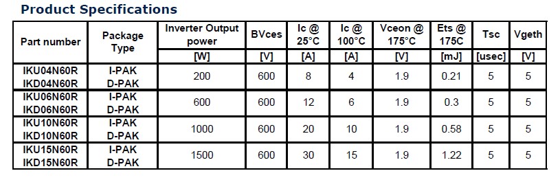 目前這種逆向?qū)ㄐ虸GBT有兩種封裝形勢(shì),一種是IPAK封裝,另外是DPAK封裝,電流有4安、6安、10安和15安四個(gè)等級(jí)。它主要的特點(diǎn)就是有非常低的價(jià)格,還有節(jié)省空間。半導(dǎo)體器件它的成本主要取決于兩個(gè)方面,一個(gè)是它的晶圓,減少晶圓的數(shù)量,從兩個(gè)晶圓減少到一個(gè)晶圓可以減少成本。另外的話,這種T0220的封裝還有這種D2PARK封裝可以減少成IPARK封裝和DPARK封裝,同時(shí)減少封裝的成本,減少了封裝的話同樣會(huì)減少它的空間,但是減少了晶圓的話會(huì)不會(huì)對(duì)它的性能造成影響?首先我們來看一下,同樣它有一個(gè)非常低的飽和導(dǎo)通壓降,對(duì)它的性能絲毫沒有任何影響。另外可以通過改變門級(jí)驅(qū)動(dòng)電阻,在寬范圍調(diào)節(jié)它的開通和關(guān)斷的時(shí)間,有一個(gè)非常好的EMI效果,非常平滑的開關(guān)波形,5us的短路保護(hù)能力,最高結(jié)溫可以達(dá)到175度。這個(gè)是這種逆向?qū)ㄐ虸GBT的主要參數(shù),這個(gè)是它的擊穿電壓,這個(gè)是它的電流,這是175度飽和導(dǎo)通壓降,這是開關(guān)的能力,這是短路保護(hù)的能力,這是它的門級(jí)驅(qū)動(dòng)電壓,基本上對(duì)于一個(gè)200W的產(chǎn)品可以選擇4安的IGBT,600W的話可以選擇一個(gè)6安的,1000W可以選擇一個(gè)10安的,1500W的可以選擇15W的產(chǎn)品。