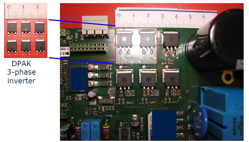 這是一個(gè)實(shí)際的PCP板上的IGBT的圖,我們看到如果用D2PARK的話,它兩顆的面積大概在2.5厘米,而如果使用DPARK封裝的話可以減少到1.5厘米左右,同時(shí)它跟IGBT模塊來相比的話可以節(jié)省0.5個(gè)美金的成本,所以對(duì)于一些消費(fèi)類市場(chǎng)低成本的產(chǎn)品這個(gè)相當(dāng)重要的。