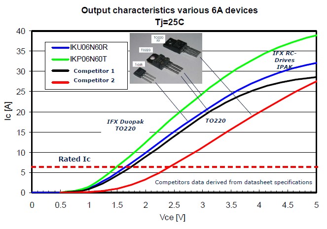 總結(jié)一下IGBT的重要特點(diǎn),一個(gè)是成本,因?yàn)樗捎玫氖且粋€(gè)晶圓,所以它的成本有很大的優(yōu)勢(shì);另外因?yàn)闇p少了它的封裝,可以給PCB留下更多的空間,進(jìn)一步提高產(chǎn)品的功率密度。同時(shí)它也有一個(gè)非常好的性能,非常低的飽和導(dǎo)通壓降,一個(gè)非常軟的開關(guān)特性對(duì)EMI非常有幫助,它還有一個(gè)很好的溫度特性,最高溫度可以達(dá)到175度。藍(lán)色曲線是逆向?qū)ㄐ虸GBT和目前TO220封裝的飽和導(dǎo)通壓降的比較。這是用一個(gè)6安的產(chǎn)品在做比較,當(dāng)這個(gè)電流在6安的時(shí)候可以看到飽和導(dǎo)通壓降非常的低。