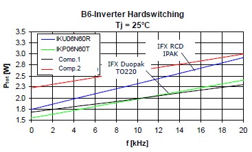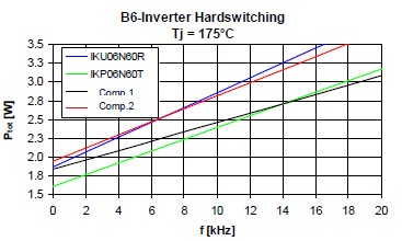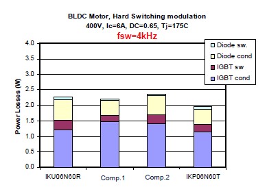 衡量一個(gè)IGBT的好壞有兩個(gè)非常重要的指標(biāo),一個(gè)就是它的飽和導(dǎo)通壓降,就是Vce(sat),另外一個(gè)就是開關(guān)損耗,也就是Eoff。對(duì)于低頻的應(yīng)用來說,飽和導(dǎo)通壓降是占有絕對(duì)支配地位的,所以選擇這種RC-Drives的IGBT會(huì)是一個(gè)非常好的選擇,因?yàn)榭梢钥吹竭@種RC-Drives IGBT的飽和導(dǎo)通壓降是遠(yuǎn)遠(yuǎn)低于市面上的一些產(chǎn)品。這個(gè)是在一個(gè)無刷電機(jī)上面的損耗的分析。