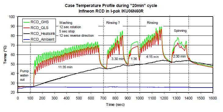 下面就是為了驗(yàn)證這種逆向?qū)ㄐ虸GBT在實(shí)際應(yīng)用當(dāng)中的一個(gè)表現(xiàn),我們?cè)谝粋€(gè)洗衣機(jī)上面驗(yàn)證了6安的IPARK的產(chǎn)品,在一個(gè)風(fēng)機(jī)上面我們驗(yàn)證了6安的DPARK的產(chǎn)品。這是一個(gè)實(shí)際的洗衣機(jī)的控制板,這種方式就是采用了夾子,然后把這個(gè)IGBT夾在散熱器上面。稍候我們會(huì)用這種IPARK的封裝對(duì)這種TO220的封裝做一些替代,然后比較一下他們的不同。就是說我們把其中的一路替代成IPARK產(chǎn)品,然后做一個(gè)效率還有溫度的檢測(cè),通過這種熱電偶的方式來檢測(cè)它的表面溫度,來檢測(cè)它的結(jié)溫。因?yàn)樗饷嬗幸粋€(gè)夾子,我們沒有辦法用紅外相機(jī)來檢測(cè)它的溫度,所以我們采用了這種熱電偶的方式。這個(gè)是洗衣機(jī)的工作流程,首先的話是抽水,這個(gè)是洗滌,這個(gè)是漂洗,這個(gè)是甩干,整個(gè)20分鐘的流程當(dāng)中它的溫度的表現(xiàn),基本上它的最高溫度沒有超過90度,我們可以看到這個(gè)綠色和紅色有一點(diǎn)稍微小小的區(qū)別,這是因?yàn)樗纳岵灰粯?,IGBT的位置放在不一樣,所以會(huì)有一點(diǎn)不一樣,這個(gè)不用太過擔(dān)心。