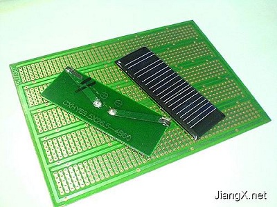 圖7是制成后的太陽能供電板,制成后就可以給一些小東西供電了,比如手電筒、收音機(jī)之類的。接幾個白色高亮LED,就成為一個太陽能LED手電筒,圖8是太陽能供電板點亮高亮LED的情景。