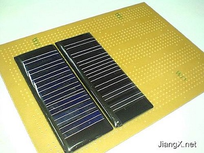 首先剪一小段金屬絲焊接在太陽能電池板的兩個電極上作為引腳(圖3),以便于連接和固定在電路板上。兩塊太陽能電池板是正極對正極,負(fù)極對負(fù)極(上面有標(biāo)識)并聯(lián)起來使用的,這樣可以有效地增強(qiáng)太陽能電池板提供電流的能力。安裝好太陽能電池板后如圖4所示。