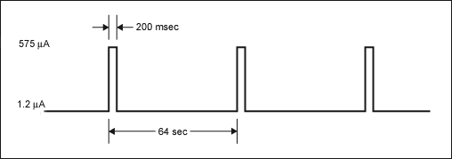 周期性地測量溫度使得器件在短時間內(nèi)(最差情況下為200ms)的電流損耗增大。圖1給出了DS3231在最差情況下的電流損耗,計算中假設(shè)電池電壓為3.63V,I²C兼容接口不工作。