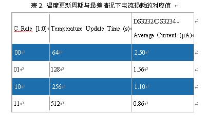 表2列出了DS3232/DS3234溫度更新周期與最差情況下電流損耗的對應(yīng)值。計算中假設(shè)電池電壓為3.63V,I²C兼容接口不工作。C_Rate位上電時默認(rèn)為0,對應(yīng)于64s的溫度更新周期。