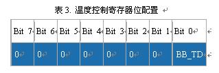 DS3234加入了溫度控制寄存器,當(dāng)器件由備用電源供電時可以禁止溫度更新。寄存器中的BB_TD位控制溫度測量禁止。該位上電時的默認(rèn)值為0,溫度更新功能有效。寄存器定義如表3所示。
