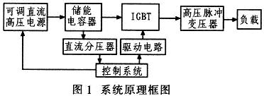 系統(tǒng)工作過程如下:由控制系統(tǒng)控制可調(diào)直流高壓電源給儲能電容器充電,當(dāng)充電電壓達(dá)到設(shè)定值后,再控制IGBT按照設(shè)定的頻率和脈沖寬度導(dǎo)通,產(chǎn)生脈沖電壓加在高壓脈沖變壓器原邊,最后由高壓脈沖變壓器升壓,產(chǎn)生所需的高壓脈沖加在負(fù)載上。