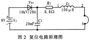 圖2中,V1為低壓直流電源,R1為限流電阻。由V1通過R1提供一個直流電流給單匝復(fù)位線圈A。在高壓脈沖變壓器工作時,單匝線圈A上會感應(yīng)較高的電壓,利用電感L1,電容C1和高壓硅堆VD1對低壓直流電源V1進(jìn)行保護。