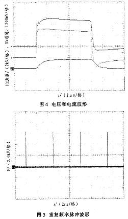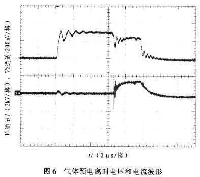 圖4中,縱坐標(biāo)為電壓幅度值(2通道2kV/格,4通道200mV/格)。通道2為電壓波形,電壓約為5kV,脈沖寬度為10μs,上升沿小于lμs。通道4為電流波形,電流值約85A(波形圖中比例為l:500)。圖5中,脈沖周期為5ms,重復(fù)頻率為200Hz。圖6中,縱坐標(biāo)為電壓幅度值(1通道5kV/格,2通道2V/格)。l通道為放電電壓波形,2通道為放電電流波形。從波形圖中可以看出,脈沖當(dāng)電壓加在氣體上時,大約經(jīng)過幾微秒時間后,氣體發(fā)生電離。此時由于分壓原因,電壓幅值略有下降,電流波形開始出現(xiàn)。在脈沖電壓加載期間,氣體維持了電離狀態(tài)。