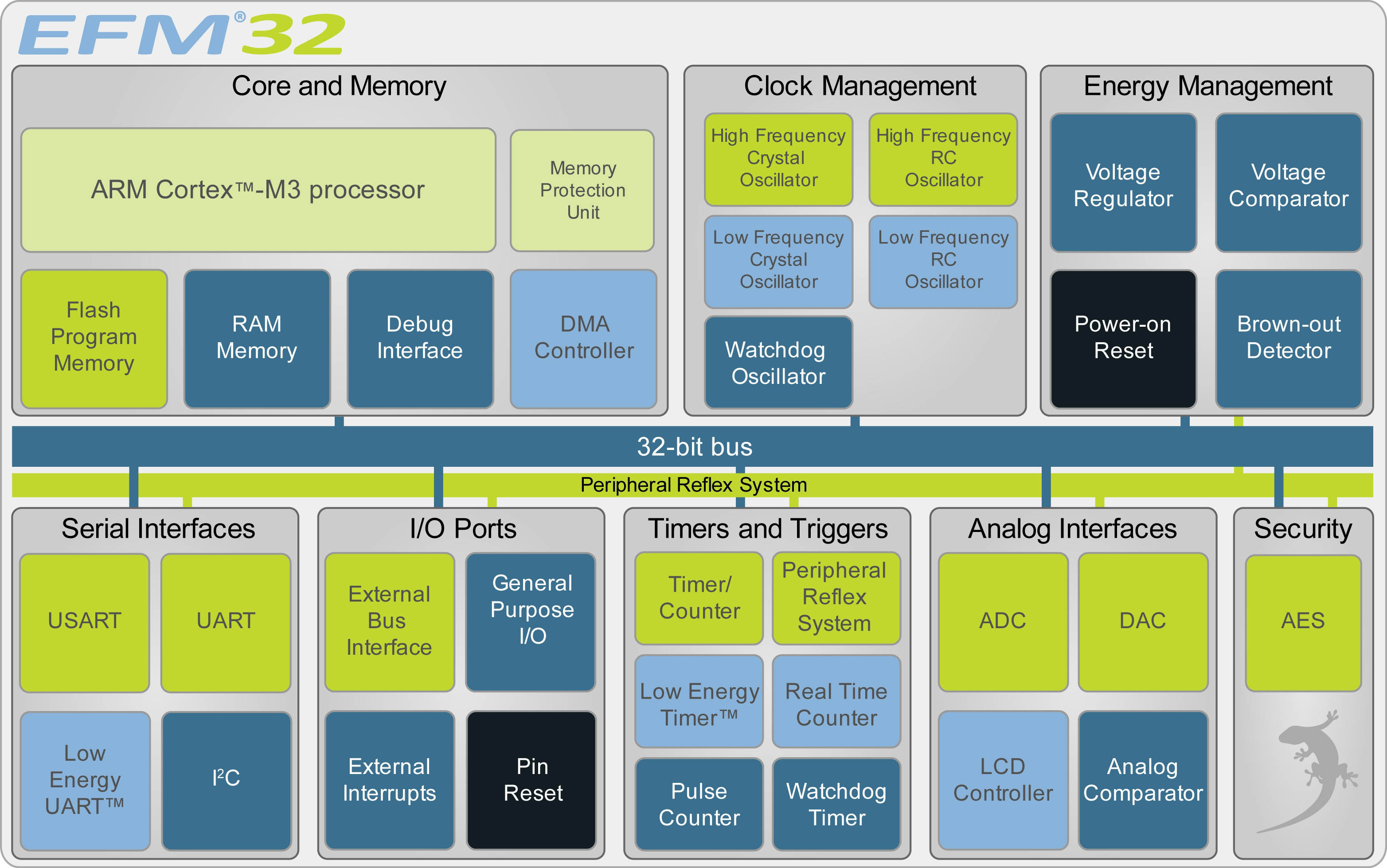 盡管有高效的32位處理器內(nèi)核的存在,有許多應用功能并不要求它具有全套處理能力,如果在待機時,即使是最節(jié)能的內(nèi)核也會使用較少的電源!因此EFM32有一個互連結構稱為外圍設備反射系統(tǒng),它使外圍設備與外圍設備之間對話而沒有來自ARM內(nèi)核的任何干擾。節(jié)能的微控制器能將功率需求減少到盡可能少,能源敏感的應用會尊重他們的冠名權。