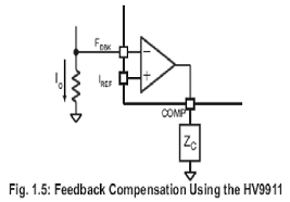 閉回路控制的形成是連接輸出電流信號至FDBKpin,同時將電流參考位準(zhǔn)連接至IREFpin,補(bǔ)償網(wǎng)絡(luò)連接至Comppin(傳導(dǎo)運(yùn)算放大器的輸出端),如圖5所示。放大器的輸出受PWM調(diào)光信號所控制,當(dāng)PWM調(diào)光信號為High時放大器的輸端連接至補(bǔ)償網(wǎng)絡(luò),當(dāng)PWM調(diào)光信號為Low時,放大器的輸出端與補(bǔ)償網(wǎng)絡(luò)被切斷,因此補(bǔ)償網(wǎng)絡(luò)內(nèi)的電容電壓維持住,一直到PWM調(diào)光信號再度回復(fù)High準(zhǔn)位時,補(bǔ)償網(wǎng)絡(luò)才又連接圖放大器的輸出端,這樣可確保電路動作正常以及獲得非常良好的PWM調(diào)光反應(yīng),而不需要設(shè)計(jì)一個快速的控制電路。