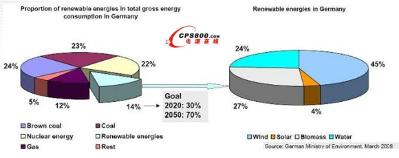 歐洲是現(xiàn)代能源和氣候政策的先驅(qū),德國是利用新能源技術(shù)方面一個(gè)最好的例證。鑒于到2020年,要實(shí)現(xiàn)減少14%的二氧化碳排放量(與2005年的排放量相比)的目標(biāo),到2020年可再生能源在初級能源消耗中的比例要增加到18%(2005年為6%)。對于德國總電力消費(fèi)來說,這意味著到2020年可再生能源的份額將增加一倍,如圖2所示。展望未來,到2050年計(jì)劃可再生能源的份額達(dá)到70%。