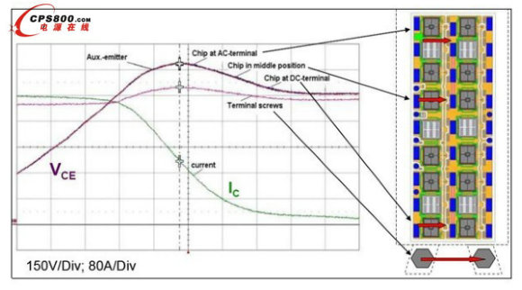 最后一點(diǎn)值得考慮的是新SKiM模塊的內(nèi)部機(jī)械設(shè)計(jì)。圖6顯示了標(biāo)有芯片位置的陶瓷襯底的布局。要注意布局的高度對稱性。在右側(cè)可以看到同時(shí)也扮演機(jī)械壓接系統(tǒng)角色的內(nèi)部功率母線。層狀母線和流經(jīng)每個(gè)芯片的電流直接使得DC+和DC端子之間的雜散電感不到20nH。至于IGBT的關(guān)斷,對于不同位置的芯片,沒有發(fā)現(xiàn)任何的差別。