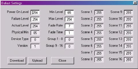 當(dāng)程序第一次加載時,“電子鎮(zhèn)流器設(shè)置(Ballastsetting)”窗口將沒有數(shù)據(jù)顯示,要完成一只實(shí)際電子鎮(zhèn)流器的設(shè)置,應(yīng)在主界面設(shè)置適應(yīng)的地址,并按下“電子鎮(zhèn)流器設(shè)置(Ballastsetting)”窗口中的“Down/Load”按鈕。
